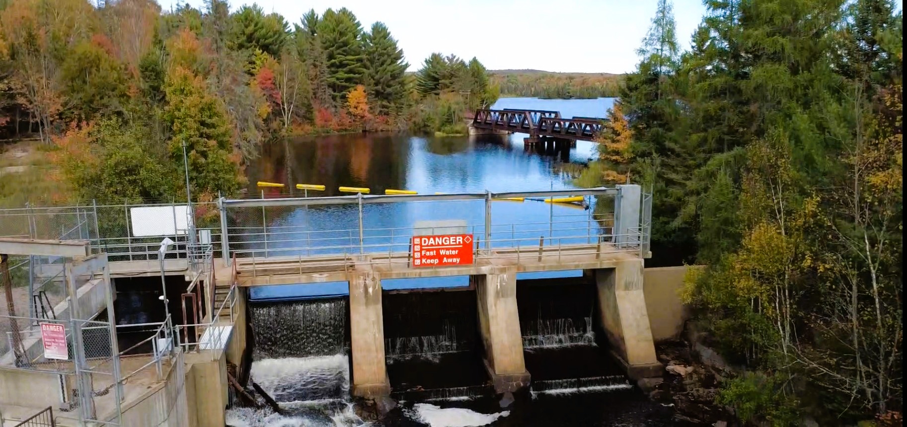 The cascade includes an active water control structure and nearby infrastructure. For your safety: