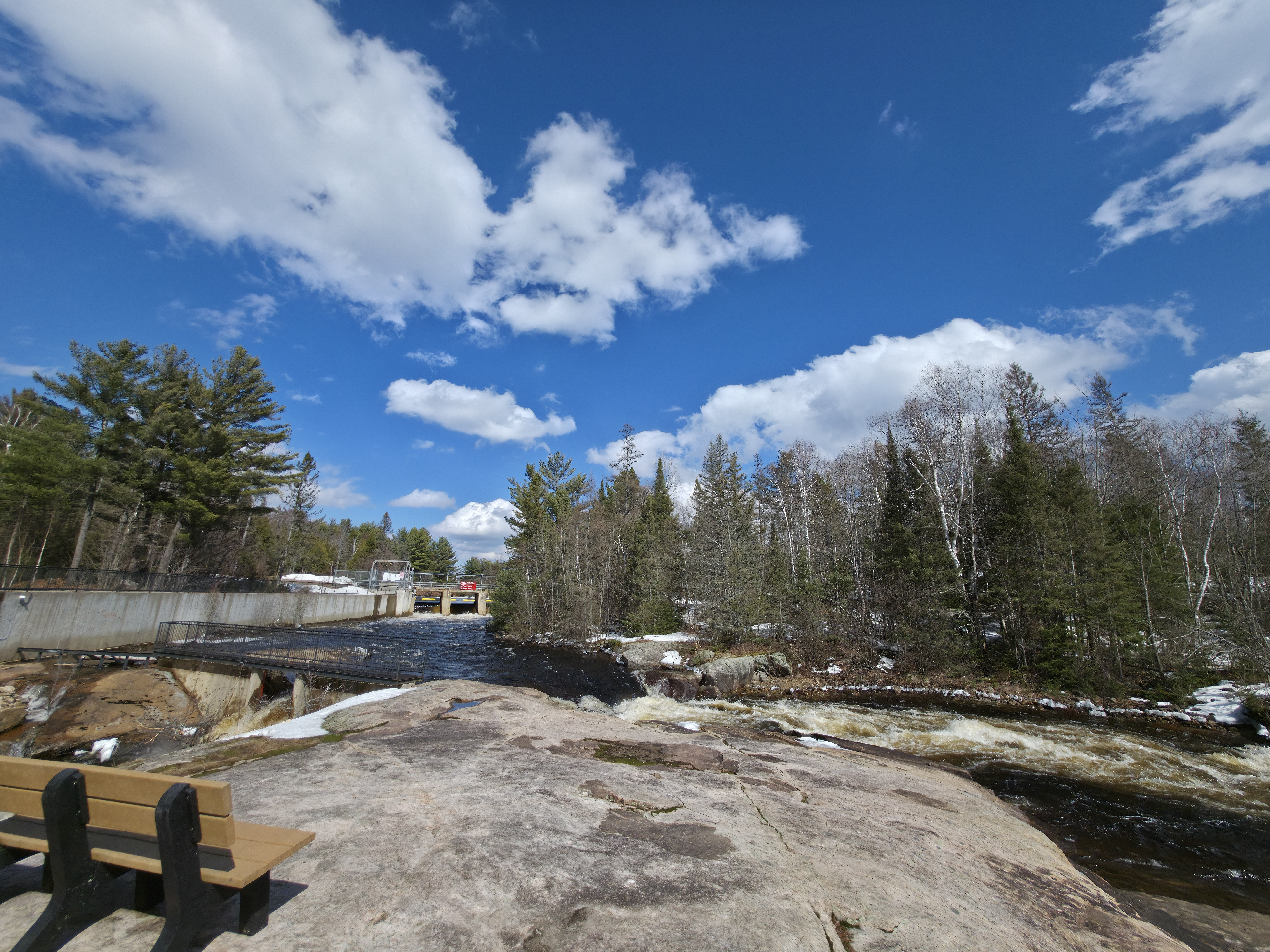 The South River Cascade is a distinctive natural and engineered feature located along Mill Road in the Village of South River. Set within a landscape of mature forest and exposed Canadian Shield rock, the cascade highlights the steady movement of water through a controlled channel, creating a peaceful and visually engaging environment.